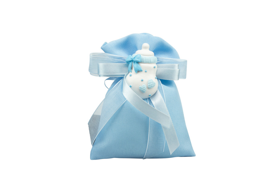 La confezione prevede riempimento del sacchetto con ovatta, cinque confetti Maxtris in bustina per alimenti, bigliettino e nastro doppio raso.