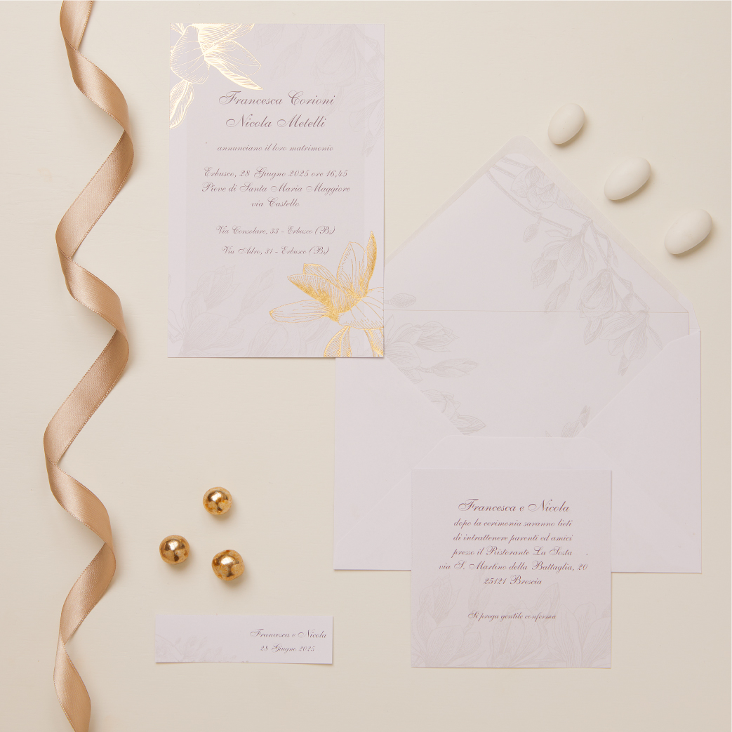 Scegliendo le bomboniere da matrimonio con un prezzo ivato superiore a €. 10,00 e con l’acquisto minimo di 50 bomboniere, Claraluna omaggia le partecipazioni stampate in misura del 10% maggiore all’ordine di bomboniere relativo (se acquistate 100 bomboniere saranno stampate 110 partecipazioni). Le partecipazioni includono: annuncio matrimonio, invito a ristorante, la busta ed il bigliettino per le bomboniere. Potrai scegliere la tua partecipazione tra i diversi modelli indicando il codice che vedi nell’immagini. Per ricevere le partecipazioni richiedi il modulo editabile in pdf, tramite whatsApp (3471065522) o e-mail (info@eventsbomboniere.it). Le partecipazioni stampate verranno inviate 30 giorni dopo il ricevimento dell’ordine.