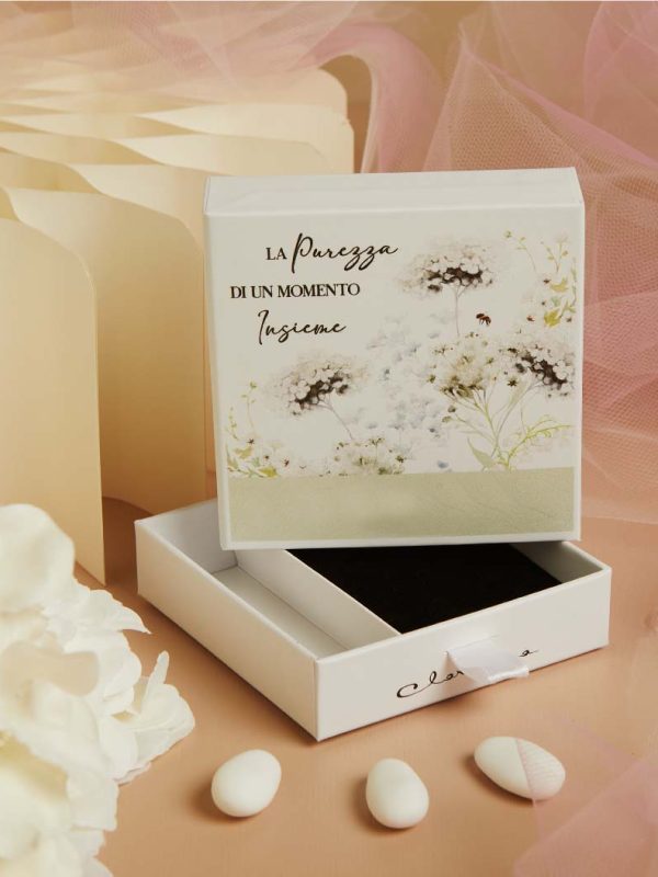 | Confezionamento | Confezionamento con 5 confetti mandorla, bigliettino e nastro doppio raso, Non Confezionato |