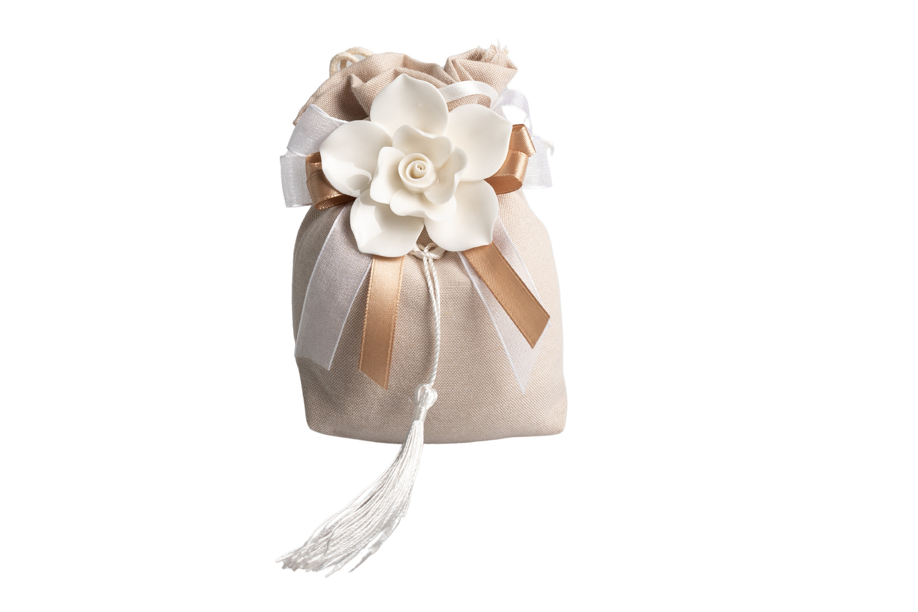 STMT25256 Sacchettone Tortora Con Fiore Porc. Bianco Con Fiocco E Magnete Fascia di prezzo: da €3,60 a €5,00
