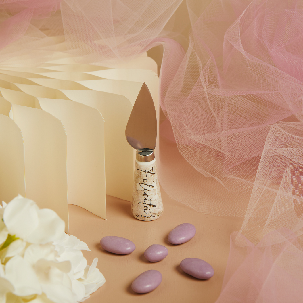 Coltellino da formaggio della collezione Claraluna con la scritta “Felicità”. È un oggetto comunemente usato come bomboniera utile per matrimoni, anniversari, battesimi o comunioni. La lama è in acciaio, mentre il manico decorato è in porcellana lucida. Presenta una decorazione floreale con la parola “Felicità” scritta in corsivo. Ideale per formaggi duri o stagionati.