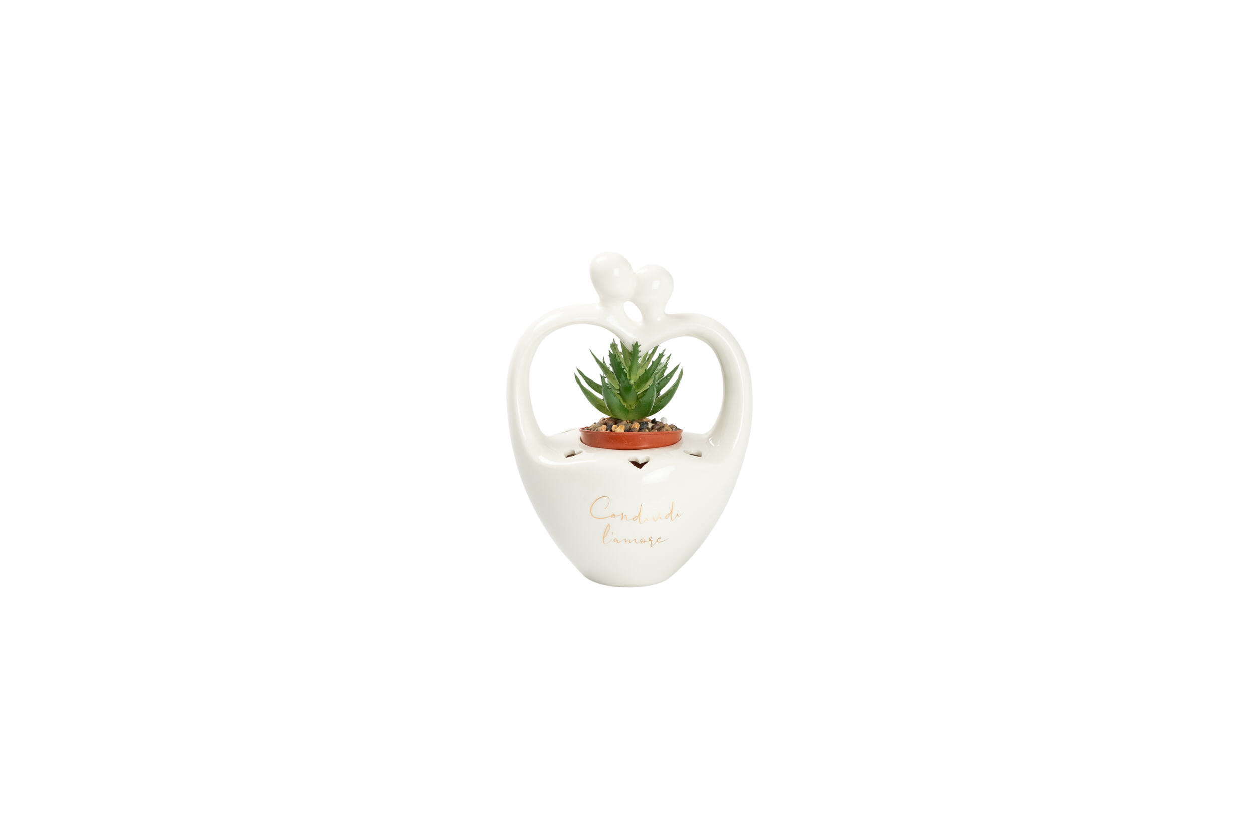 PRMT26163 Porta Piantina Porcellana Bianca Con Manico Coppietta. Con Pianta Inclusa. Con Frase E Con Box E Fazzoletto