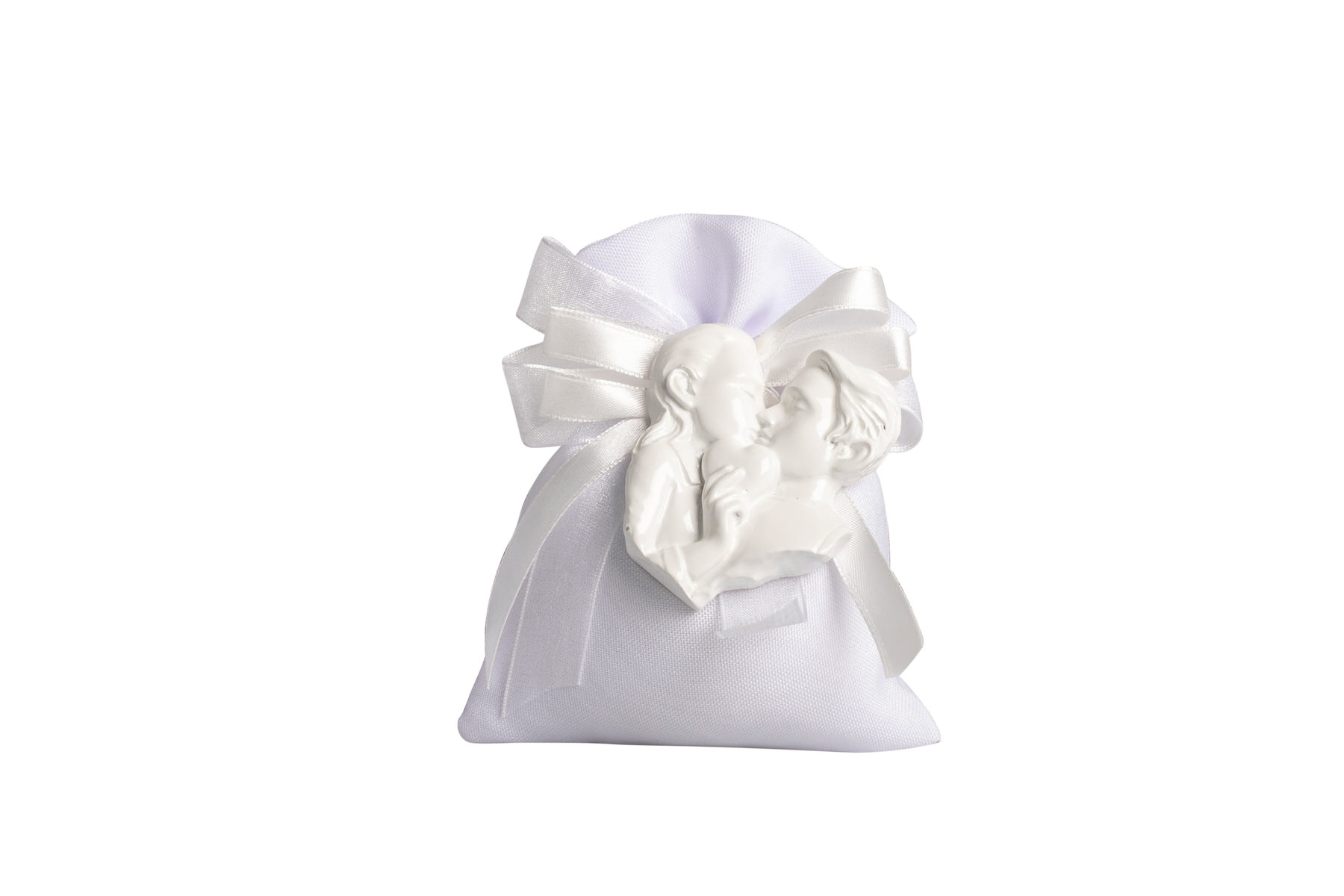 La confezione prevede riempimento del sacchetto con ovatta, cinque confetti Maxtris in bustina per alimenti, bigliettino e nastro doppio raso.