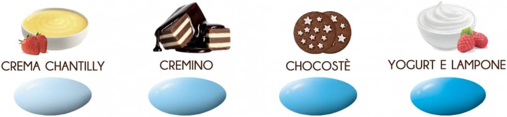 Cioccolato bianco (45%) (zucchero, latte intero in polvere, burro di cacao. Emulsionante: lecitina di soia. Aroma naturale di vaniglia), zucchero, cioccolato fondente (17%) (zucchero, pasta di cacao, burro di cacao. Emulsionante: lecitina di soia. Aroma naturale di vaniglia), cioccolato al latte (15%) (zucchero, latte intero in polvere, burro di cacao, pasta di cacao. Emulsionante: lecitina di soia. Aroma naturale di vaniglia), amido di riso, maltodestrina. Aromi. Coloranti: E170, E133. Agenti di rivestimento: cera carnauba (E903), cera d’api (E901).