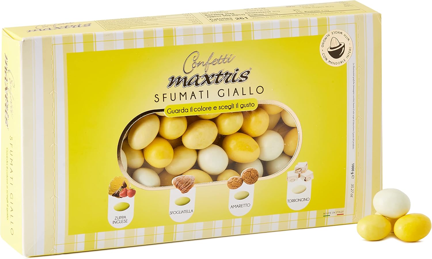 Confetti con mandorla tostata ricoperta di cioccolato bianco o al latte ai gusti assortiti (zuppa inglese, sfogliatella, amaretto, torroncino) e da un sottile strato di zucchero. Senza glutine.