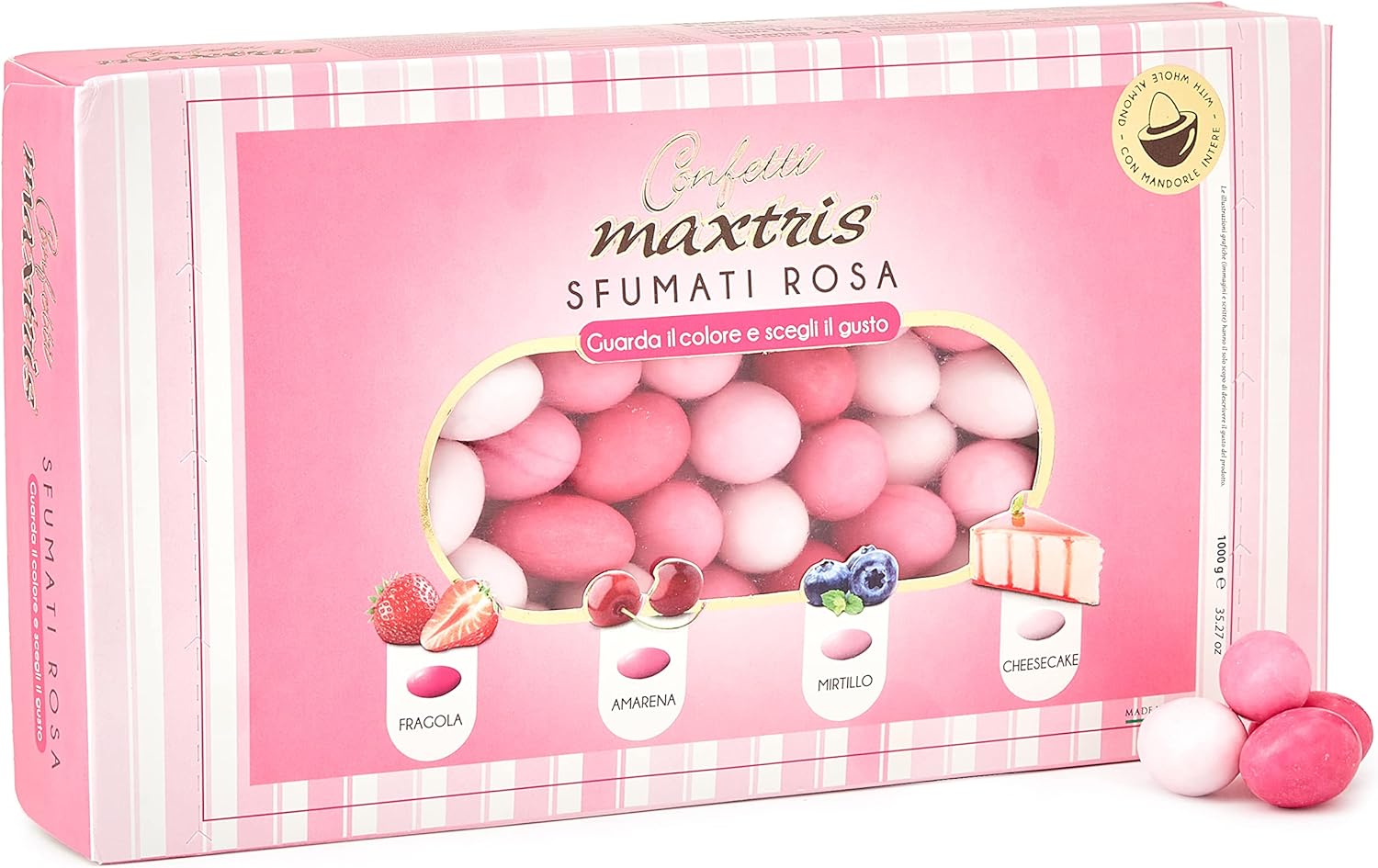 Confetti con mandorla tostata ricoperta di cioccolato (bianco, al latte e alle nocciole gianduia) ai gusti assortiti (nut, muffin, crème caramel, caramello e fleur de sel). Senza glutine.