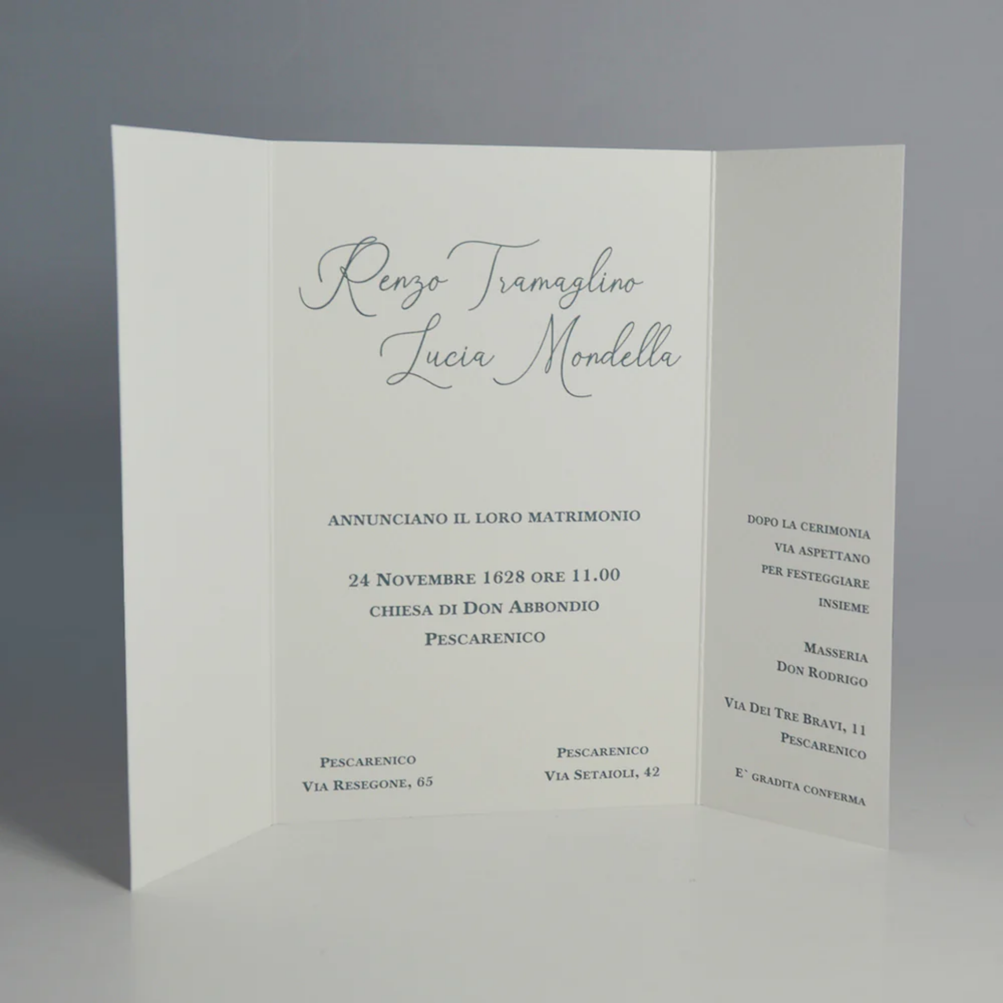 Una volta effettuato l’ordine invieremo tramite e-mail il modulo editabile, che ci dovrà essere reinviato per procedere alla stampa, compilato con i dati richiesti e dove potrete indicare il colore ed il numero del carattere di stampa preferito. Montaggio delle partecipazioni non incluso, verrà inviata una già montata come esempio.