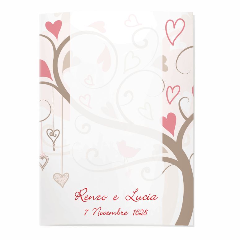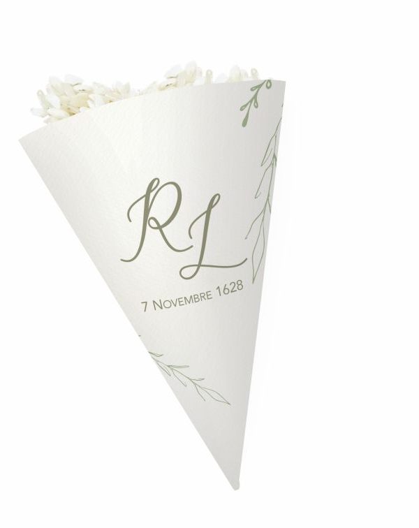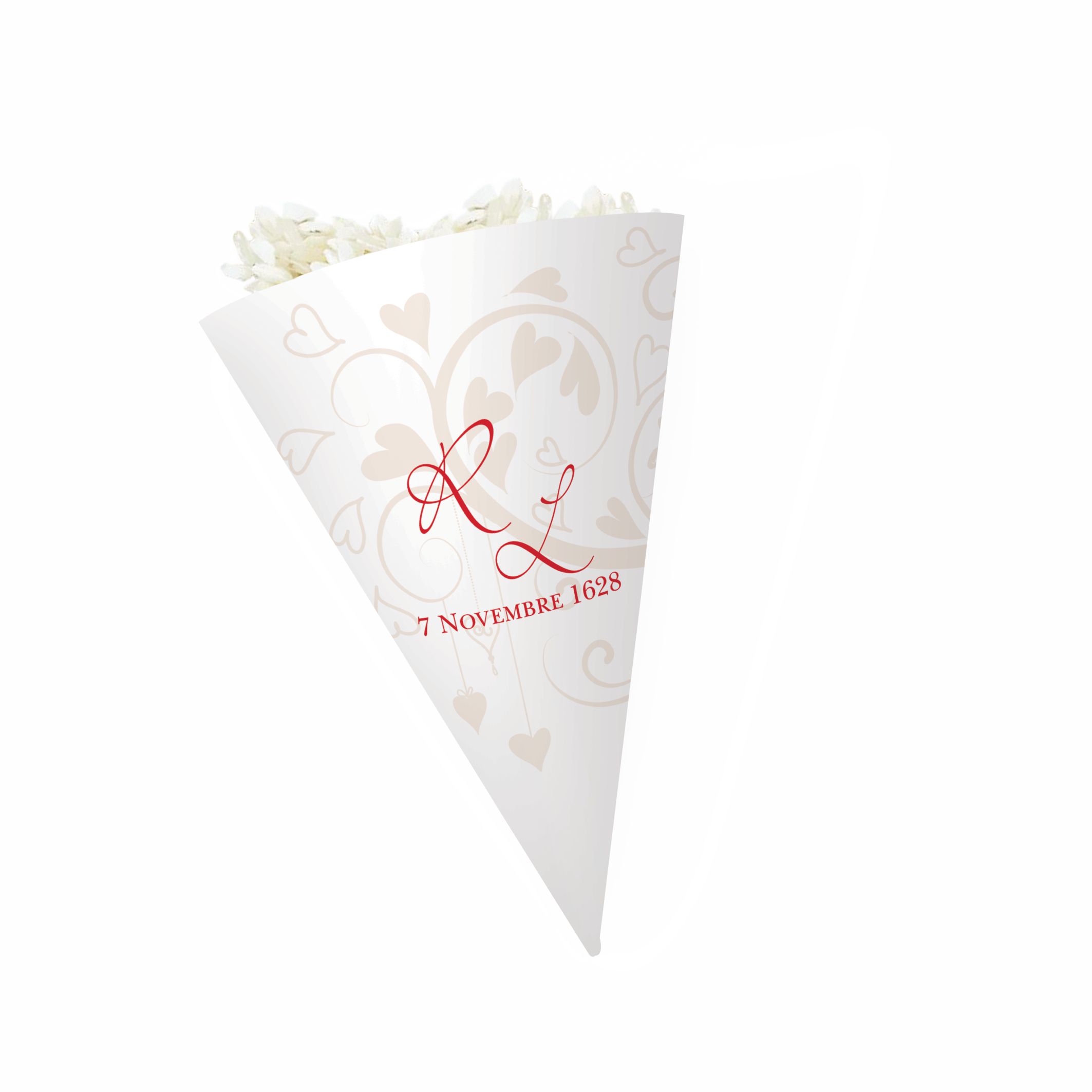 Cono porta riso della linea Dreaming in cartoncino stampato con albero stilizzato fatto di cuori. personalizzato con iniziali sposi e data del matrimonio.
