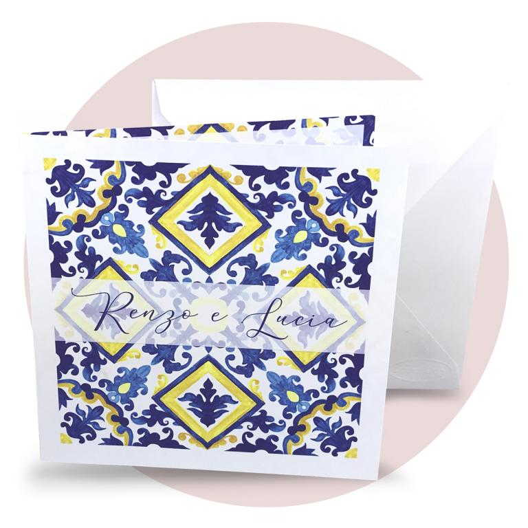 Libretto messa formato A5, copertina usomano con stampa decori maioliche e personalizzazione con nomi sposi e data. Pagine interne bianche stampate in nero, spillatura compresa, max 16 facciate.