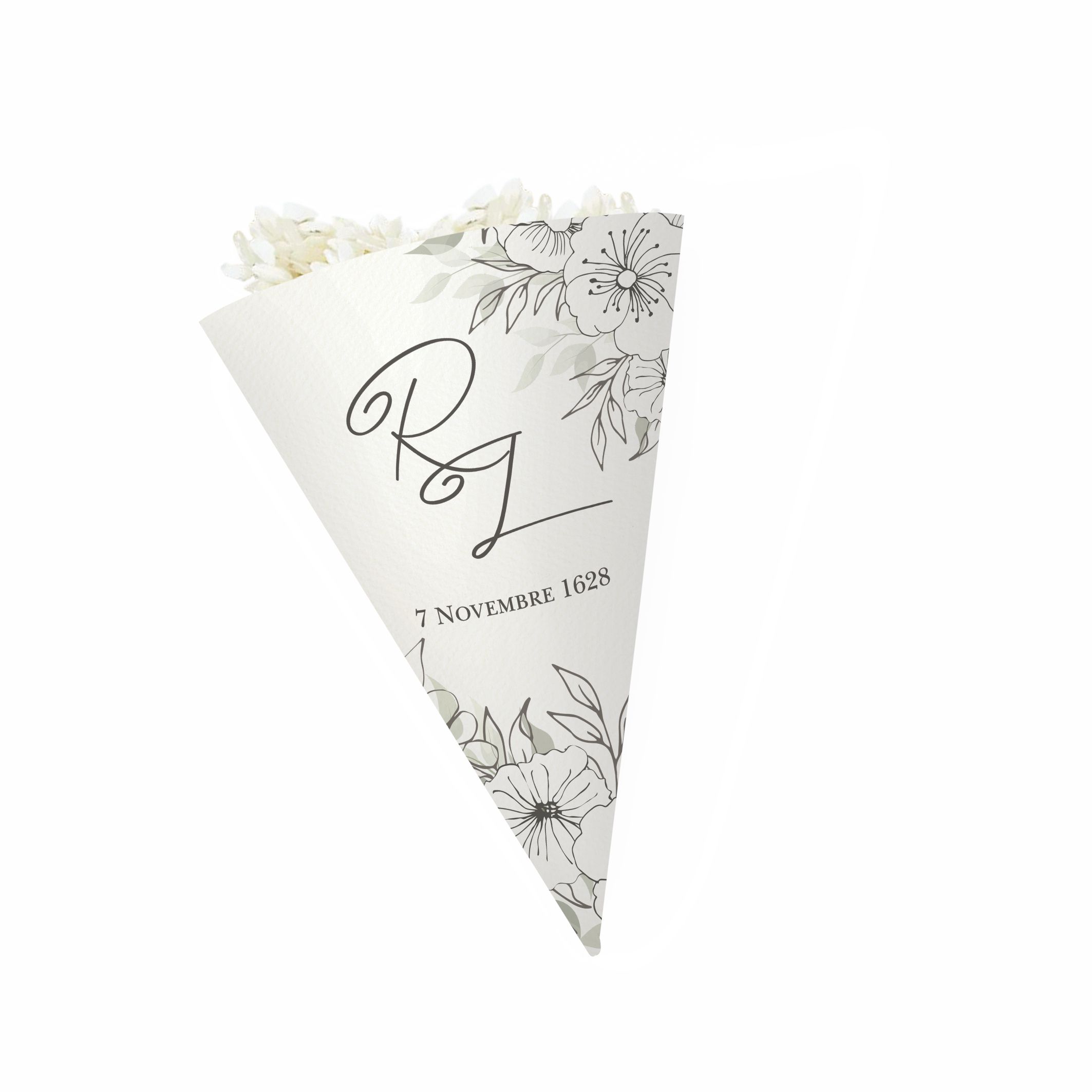 Cono porta riso della linea Dreaming in cartoncino stampato con motivo fiori stilizzati su fondo bianco. Personalizzato con le iniziali degli sposi e data matrimonio.