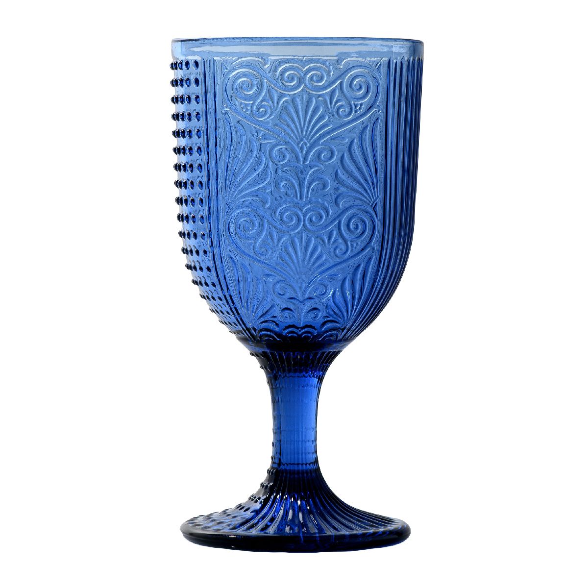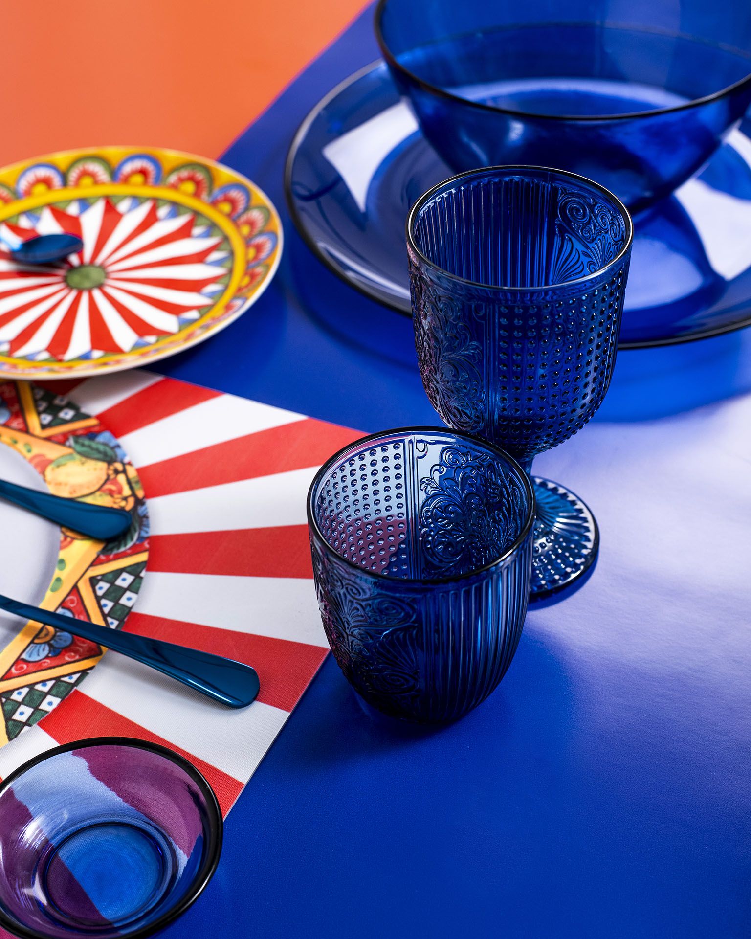 Set di 6 bicchieri da acqua in pasta di vetro blu decorati a rilievo. Perfetti per dare un tocco di originalità e colore alla tua tavola. Lavabili in lavastoviglie.