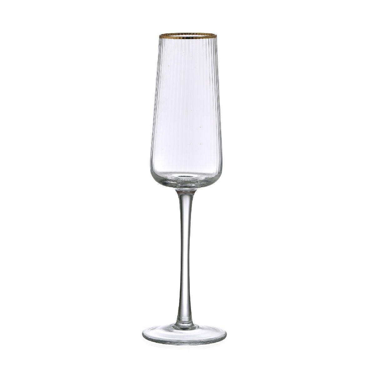 Questo flute in vetro bombato è lo strumento giusto per serate mondane ed eventi eleganti, grazie anche alla rifinitura dorata del bordo che gli conferisce ulteriore luminosità e brillantezza. Combina stile e modernità, traducendosi in un modello dal decoro ricercato e dalle tante sfaccettature, grana verticale tridimensionale, geniale maestria. Bellezza e forza coesistono, trama verticale che riflette una lucentezza diversa nella luce. Lavabile in lavastoviglie.